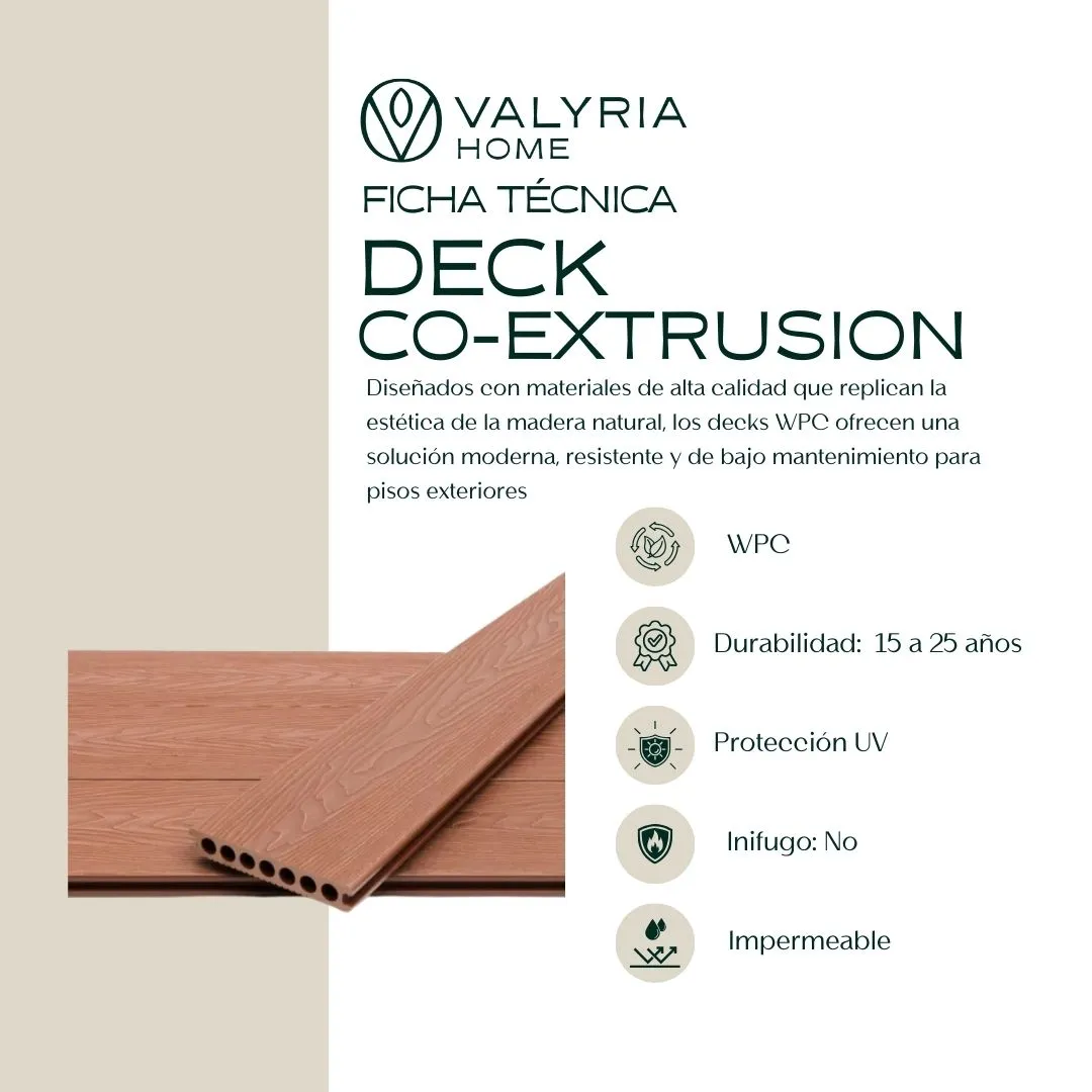 Transformá tus espacios exteriores con nuestro Deck de Coextrusión, diseñado para máxima resistencia y estética duradera. Su composición innovadora combina 60% madera, 30% plástico y 10% aditivos, ofreciendo lo mejor de ambos mundos: la calidez de la madera con la resistencia del polímero.