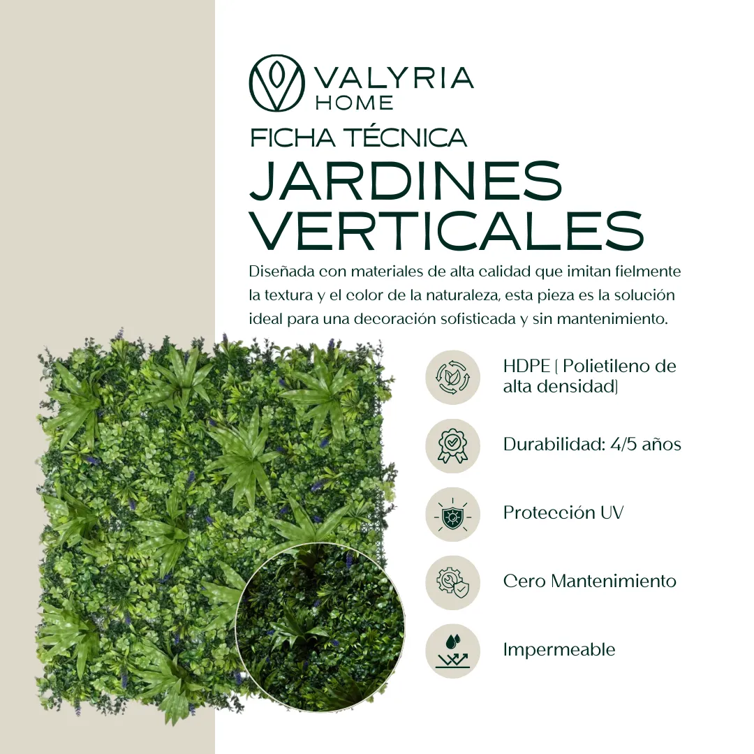 A diferencia de otros paneles, el Jardín Vertical Lacar mide 1 x 1 metro, ofreciendo una cobertura mayor y un aspecto más tupido y realista. Es una opción premium frente a los paneles de 60 x 40 cm, ideal para proyectos de decoración más grandes y creativos. Es perfecto para hogares, oficinas, balcones, terrazas, locales comerciales y más.